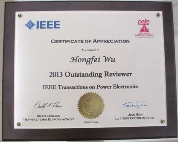 2014年3月16日至20日,第29届IEEE应用电力电子学年会在美国沃斯堡召开,在期间举行的IEEE Transactions on Power Electronics(TPE)编委会会议上,我院电气工程系教师吴红飞博士被授予TPE Outstanding Reviewer(杰出审稿专家奖),以表彰他过去一年里作为审稿人对TPE付出的辛勤劳动和做出的突出贡献。
