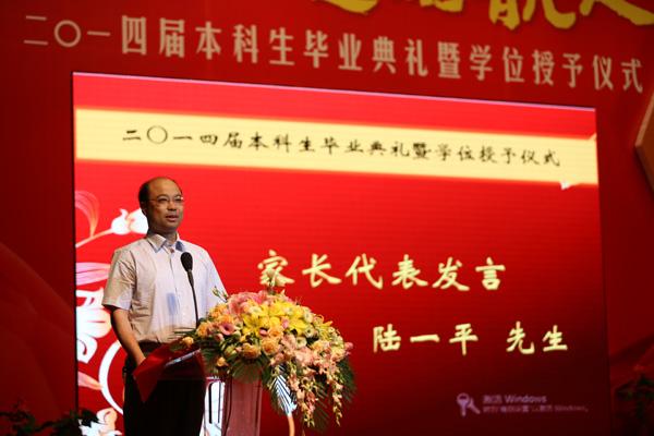 学生家长陆一平先生代表全体毕业生家长感谢南航四年来对孩子的培养,对孩子各方面能力的提升,综合素质不断提高,他表达了家长的欣喜之心和感恩之情。同时,他对南京航空航天大学的治学精神和办学理念给予了高度的肯定,并表达了对南航学子的殷切期望与要求。
