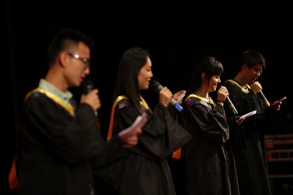 之后2014届毕业生代表汪珏、王慧哲、曾蕃予和张文仙同学演唱了《青春纪念册》,唱出了对同学们的不舍和回忆。并播放了四人前期翻唱录制的2012届毕业歌曲《再晚》视频,感染了在场的每一位同学。