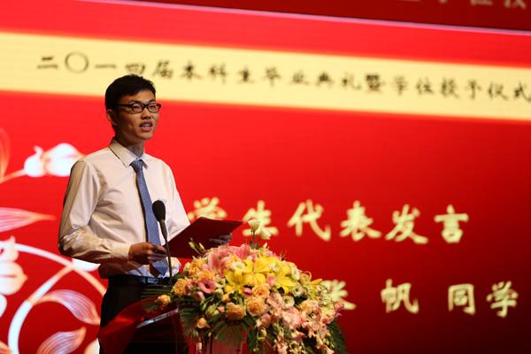 正式典礼在雄壮的国歌声中开始。首先,2014届毕业生代表张帆同学代表全体毕业生对母校四年来的关怀表达了真挚谢意。回首四年走过的日日夜夜,都已变成美好的回忆篆刻在每个人的心中。与所有2014届毕业生一起共勉:“效法羲和驭天马,志在长空牧群星”,并祝福南航、祝福学院:人才辈出!桃李芬芳!