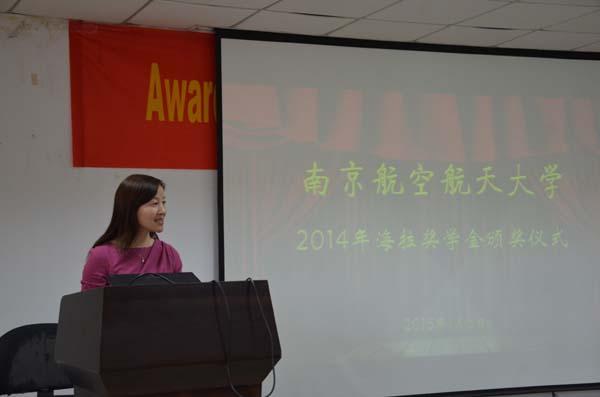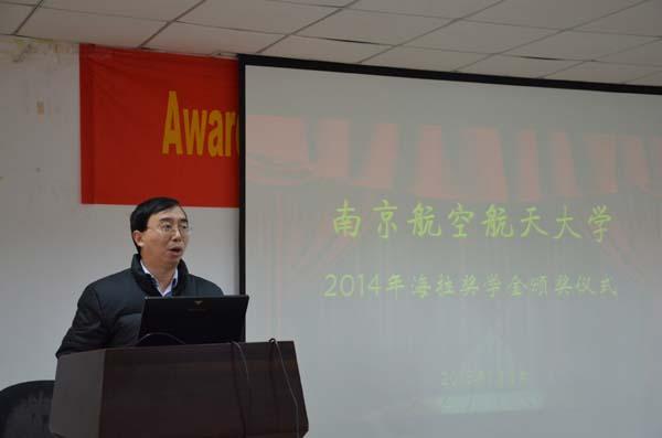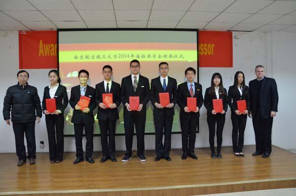 2015年1月6日上午,南京航空航天大学2014年海拉奖学金颁奖仪式在明故宫校区智能楼四楼报告厅举行。参加此次颁奖典礼的嘉宾有海拉亚太区人力资源执行副总裁兼中国区总部副总经理管莉女士、中国区灯具业务TtM高级副总裁Dr. Frank Huber、中国区灯具事业部研发总监Chris Kirchenbauer先生、海拉电子南京研发中心项目管理总监Peter G. Dieh先生、海拉亚太区组织发展人力资源总监宁晓婷女士、海拉南京研发中心人力资源经理刘帆女士、亚洲成人一区院长姜斌教授、校研究生院副院长孙占久老师,航天学院党委书记季海群老师,机电学院党委副书记许赞老师。本次颁奖仪式由亚洲成人一区党委副书记沈伯秀老师主持。