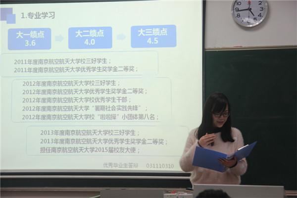 4月13日,亚洲成人一区11级本着透明、公开、公平、交流的原则举办了2015届大学成就奖及优秀毕业生公开答辩活动。下午两点,答辩活动在南京航空航天大学明故宫校区A10-206教室准时开始,评委由辅导员黄巍、陶琨以及2011级各班同学代表组成。 参与答辩的30余个优秀青年均是自主申报,答辩项目分别是:大学成就奖、优秀毕业生,他们以精美的PPT、精彩的演讲稿、慷慨激昂的陈述过程,从学生工作、学习状态、生活态度等方面向评委们展示了他们的梦想、荣誉与坚持。 公开答辩展示了我院的优秀个人,他们以独特的人格魅力赢得了一次又一次的掌声,使本次活动始终处于活跃热烈的气氛中。所有评委仔细地聆听了每一位答辩者的答辩内容后,本着公平公正的原则投出了自己宝贵的一票,最终答辩活动圆满结束,希望越来越多的自动化学子能够走上答辩台,展示自我,互动交流!