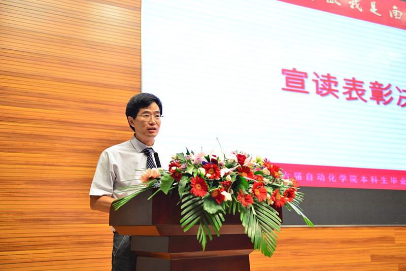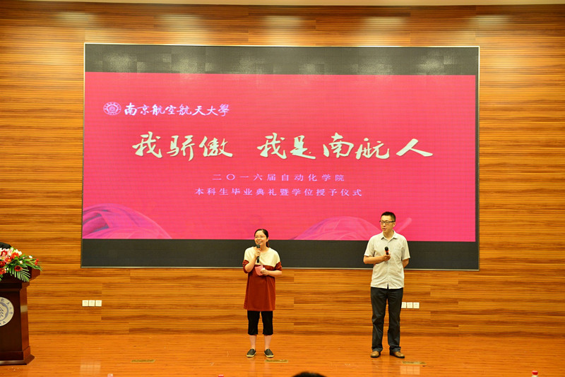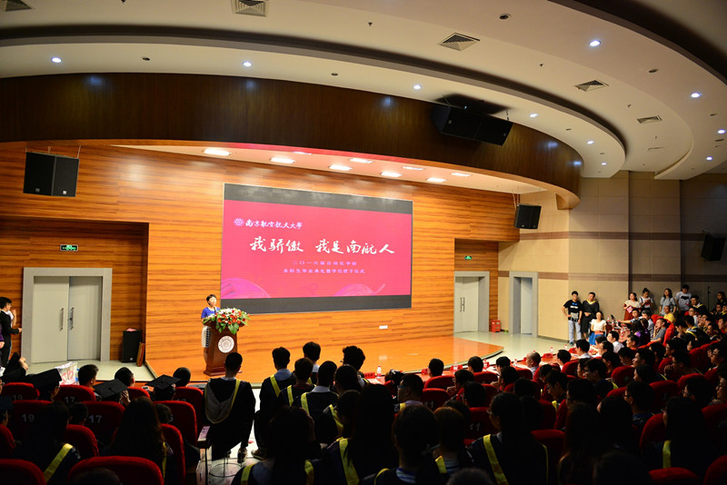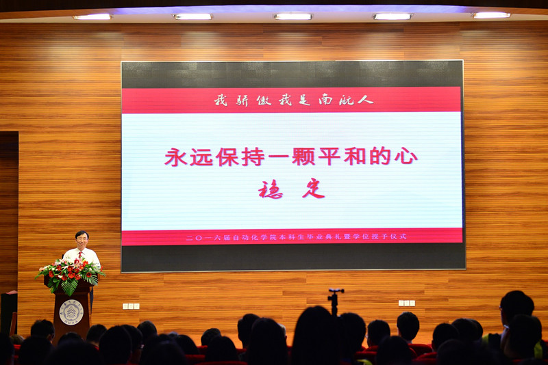 学院院长姜斌教授代表全院师生,向圆满完成学业的2016届全体毕业生们表示最热烈的祝贺和最真诚的祝福。他肯定了2016届毕业生用四年的汗水与奋斗写成的漂亮的成绩单,同时也用控制理论中“稳定”“容错”“反馈”“调参”等关键词,勉励同学们带着平和、宽容、感恩、自律的心出发,走上幸福之路。最后,他期望同学们常回亚洲成人一区这个大家庭看看,全场掌声不断。