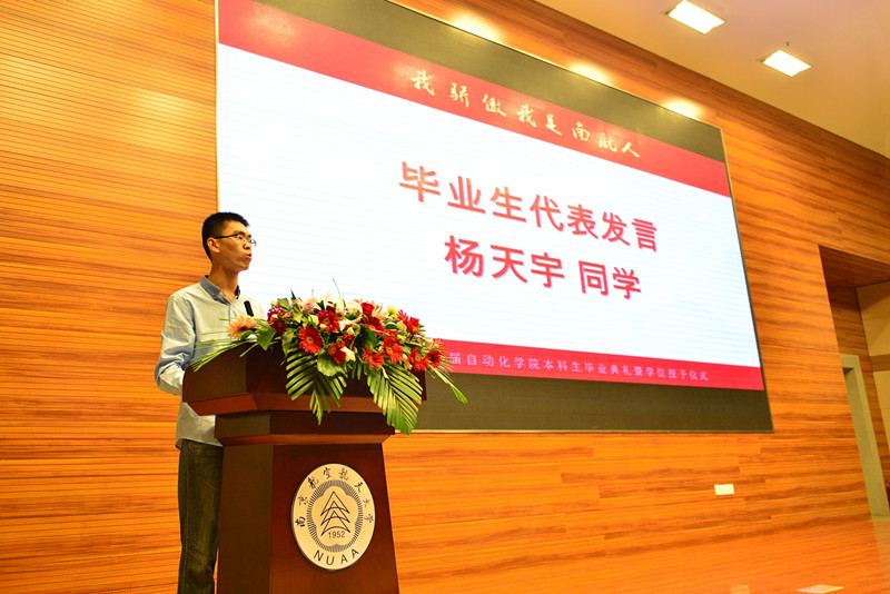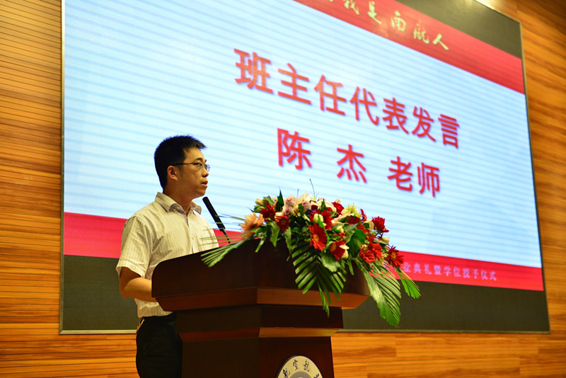陈杰老师作为毕业班班主任代表,回顾了四年来与同学们相处的美好时光,祝福同学们前程似锦,成为南航和亚洲成人一区的骄傲。