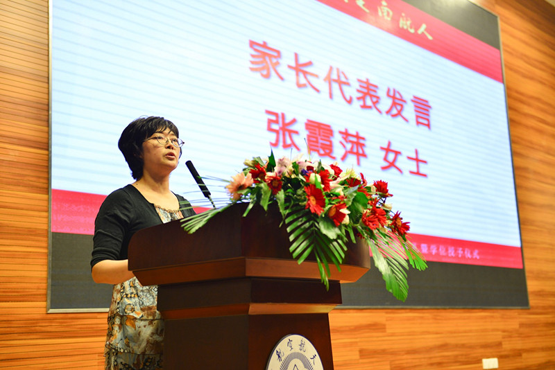 张霞萍女士代表全体毕业生家长感谢南航和亚洲成人一区在过去四年里对孩子们的培养,表达了对南航和亚洲成人一区未来发展的美好祝福。