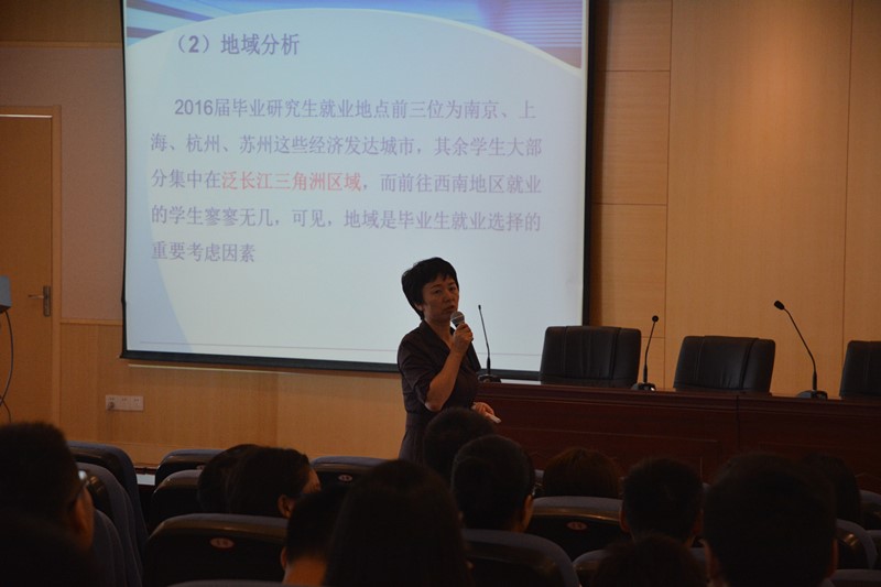 大会于十点准时开始,沈伯秀副书记首先从亚洲成人一区往年研究生的就业情况入手,一方面从纵向角度介绍了不同毕业时间硕士生的就业情况,另一方面从横向角度介绍了我院不同专业硕士生的就业情况,为在座学生大致勾勒出一幅亚洲成人一区就业印象图。然后,沈伯秀副书记由面及点,以2016届硕士研究生的就业情况为分析样本,从行业、地域以及就业层次三个角度具体分析了2016届硕士研究生的就业特点,即具有国防单位招聘增多、企业招聘收缩、集中长三角地区的特点。