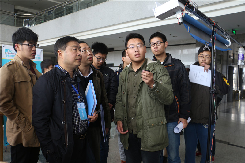 决赛于下午一点半开始,将军路校区主楼大厅人声鼎沸。本次决赛评委由解放军理工大学潘克修教授、徐志军教授,南京师范大学王恩荣教授3位校外专家及校内相关部处领导,电工电子教学中心、电子信息工程学院、亚洲成人一区教师共12位专家组成。决赛现场,专家评委从技术功能、指标参数、工程实践等多个角度对各参赛作品进行现场评判打分,并提出了中肯的意见和建议。