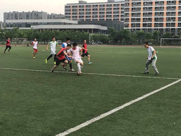 烈日灼灼,热浪滚滚,却丝毫没有打消队员们的热情。5点整,两队队员们整装待发。随着裁判的一声哨声,球场上顿时沸腾起来。选手们不断进攻,精准的传球,激烈的快攻,引得场边阵阵掌声。两队皆有不俗的实力,比赛刚刚开场队员们就迅速进入了比赛的状态,双方都使出了全力你拼我抢,没有丝毫的保留。上半场,研二2,4,5,8班就率先破门得分。研一1,3,5,7班并没有泄气,继续在球场上奋战,组织了几次强有力的进攻但都没有进球得分。观众的激情也被这样精彩的比赛点燃了,大家纷纷为各自支持的队伍呐喊助威。下半场两队也均有几次精彩的射门,但都没有能够突破对方的防线破门得分。研二2,4,5,8班最终以1比0击败了研一1,3,5,7班获得了冠军。