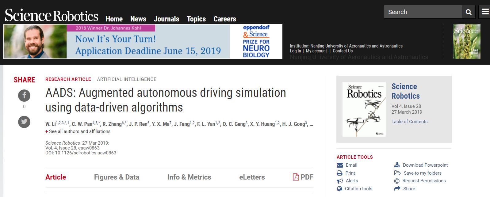 近日,我校自动化博士生李伟以第一作者和共同通讯作者身份,在《科学》杂志子刊《科学·机器人学》(Science Robotics)上刊登发表的学术论文“AADS: Augmented Autonomous Driving Simulation Using Data-Driven Algorithms”,该论文突破了现有的自动驾驶仿真技术存在的许多障碍。