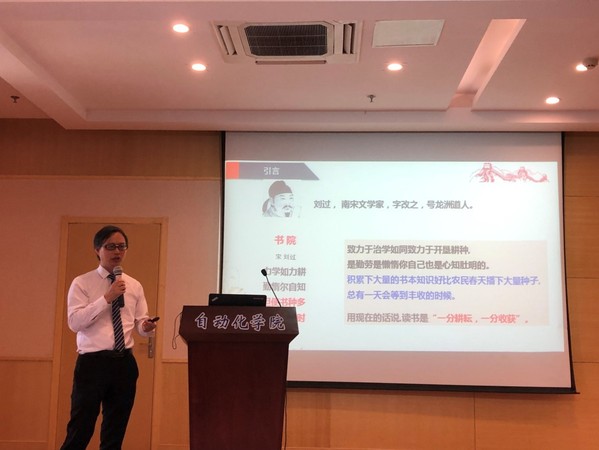 紧接着,副院长陈谋代表南航年度人物进行宣讲,研究生领航工程拉开帷幕。陈院长以近期几个热点事件为例,提出了多读书才能“吵赢架”的观点,引出了多读书的必要性。随后,陈院长以求学、从教和科研的亲身经历为素材,引用大量古今中外的诗词名句,旁征博引,深入浅出的讲解了自己对学习、科研的理解,并希望同学们拥有甘坐冷板凳的坚守、攀登科学高峰的拼搏、对国家、社会的无私奉献精神,引起台下同学们阵阵掌声。