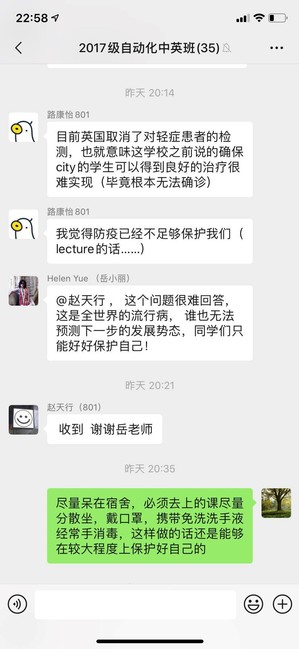 同学们觉得目前英国的防疫措施无法保障他们的健康安全,且目前班级内已有部分同学有回国打算。齐老师已就学生反映的情况与学院相关领导、学校学院相关部门沟通,并通过视频会议了解和传达学校、学院对中英班受疫情影响后续可能出现的情况的应对措施。已通过微信群班会告知大家在英国期间要注意个人防护,如果选择回国,要向辅导员报备,入境时要如实申报个人境外活动信息。