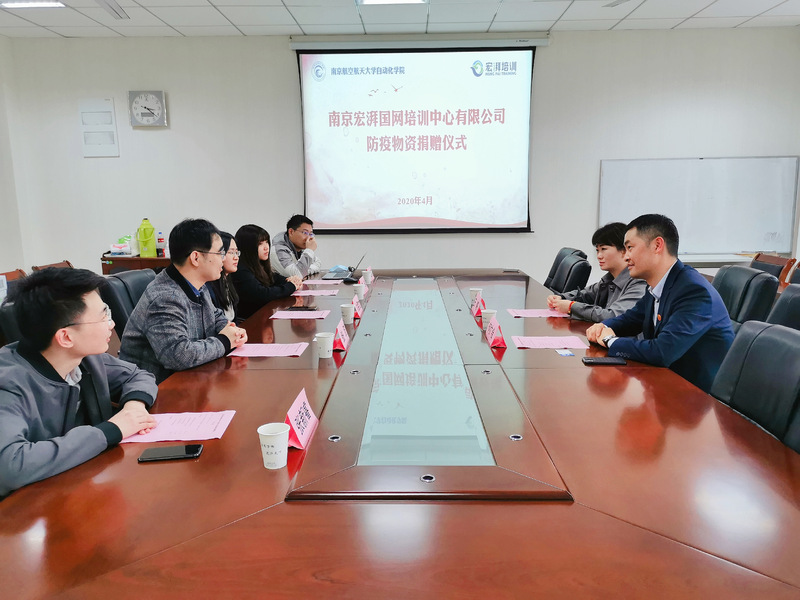 4月16日下午,南京宏湃国网培训中心有限公司防疫物资捐赠仪式在亚洲成人一区1号楼405会议室举行。企业代表何广会、王略,以及我院党委副书记张跃、团委书记刘斐文和各年级辅导员出席此次仪式。