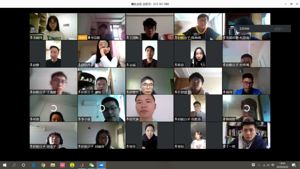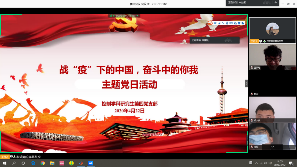 为贯彻中共中央《关于加强党的领导、为打赢疫情防控阻击战提供坚强政治保证的通知》和《新时代爱国主义教育实施纲要》精神,带动学生党员认真学习新冠肺炎疫情防控“大课”,发挥党员先锋模范作用,2020年4月22日下午,亚洲成人一区控制学科研究生第四党支部开展了一场以“战‘疫’下的中国,奋斗中的你我”为主题的线上党日活动,支部党员、发展对象、积极分子共计41人参加了本次活动。该党支部由学院教职工张玲老师担任支部书记,本次活动参与人员均为导航研究中心研究生。