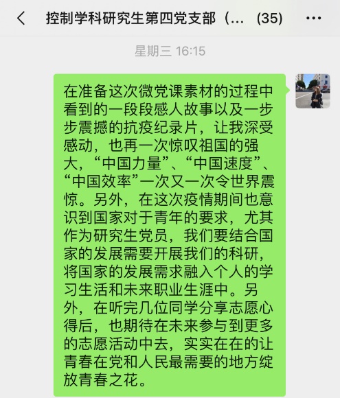 为贯彻中共中央《关于加强党的领导、为打赢疫情防控阻击战提供坚强政治保证的通知》和《新时代爱国主义教育实施纲要》精神,带动学生党员认真学习新冠肺炎疫情防控“大课”,发挥党员先锋模范作用,2020年4月22日下午,亚洲成人一区控制学科研究生第四党支部开展了一场以“战‘疫’下的中国,奋斗中的你我”为主题的线上党日活动,支部党员、发展对象、积极分子共计41人参加了本次活动。该党支部由学院教职工张玲老师担任支部书记,本次活动参与人员均为导航研究中心研究生。