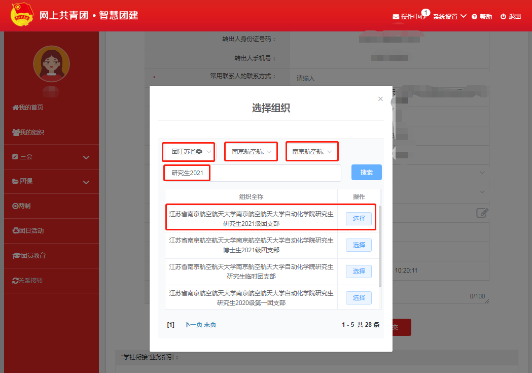 智慧团建信息转接:转入团支部名称:江苏省南京航空航天大学南京航空航天大学亚洲成人一区研究生2021级团支部。下附具体流程。