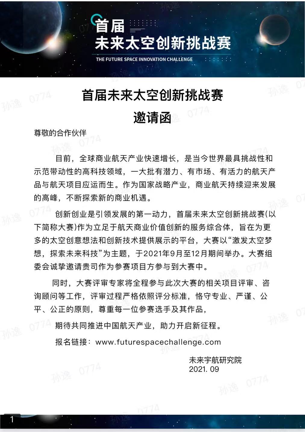 现接到未来宇航研究院《关于举办“首届未来太空创新挑战赛”的通知》,详见附件。大赛以“激发太空梦想,探索未来科技”为主题,于2021年9月至12月期间举办,符合条件的项目可通过附件官网报名。获奖项目除了深度资本对接、媒体宣传、落地支持,还有一些搭载机会等综合奖励。