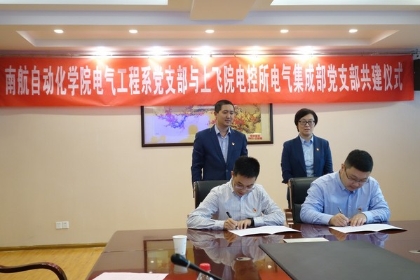 在李忆书记和李文雷书记的指导下,举行了简洁的校企党支部结对共建签约仪式。由亚洲成人一区电气工程系党支部书记陈杰与上飞院电气集成部党支部副书记兼副部长姬昌睿代表双方单位签署协议。