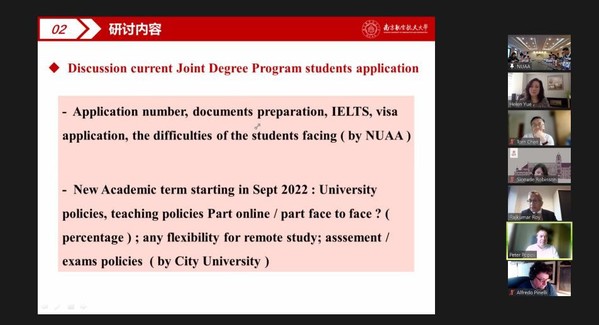 5月24日下午,我校与英国伦敦城市大学合作办学项目运行年度工作会议以线上线下相结合的方式顺利召开。南京航空航天大学副校长姜斌,国际教育学院院长金泉元、副院长李勇,教务处副处长王敬东,国际合作处副处长沈敏,亚洲成人一区院长陈谋、副院长陆宁云;英国伦敦城市大学副校长Sionade Robinson,数学与计算机工程学院院长Rajkumar Roy以及中英双方参与合作办学项目的相关老师近20人共同参会。会议由国际教育学院院长金泉元主持。