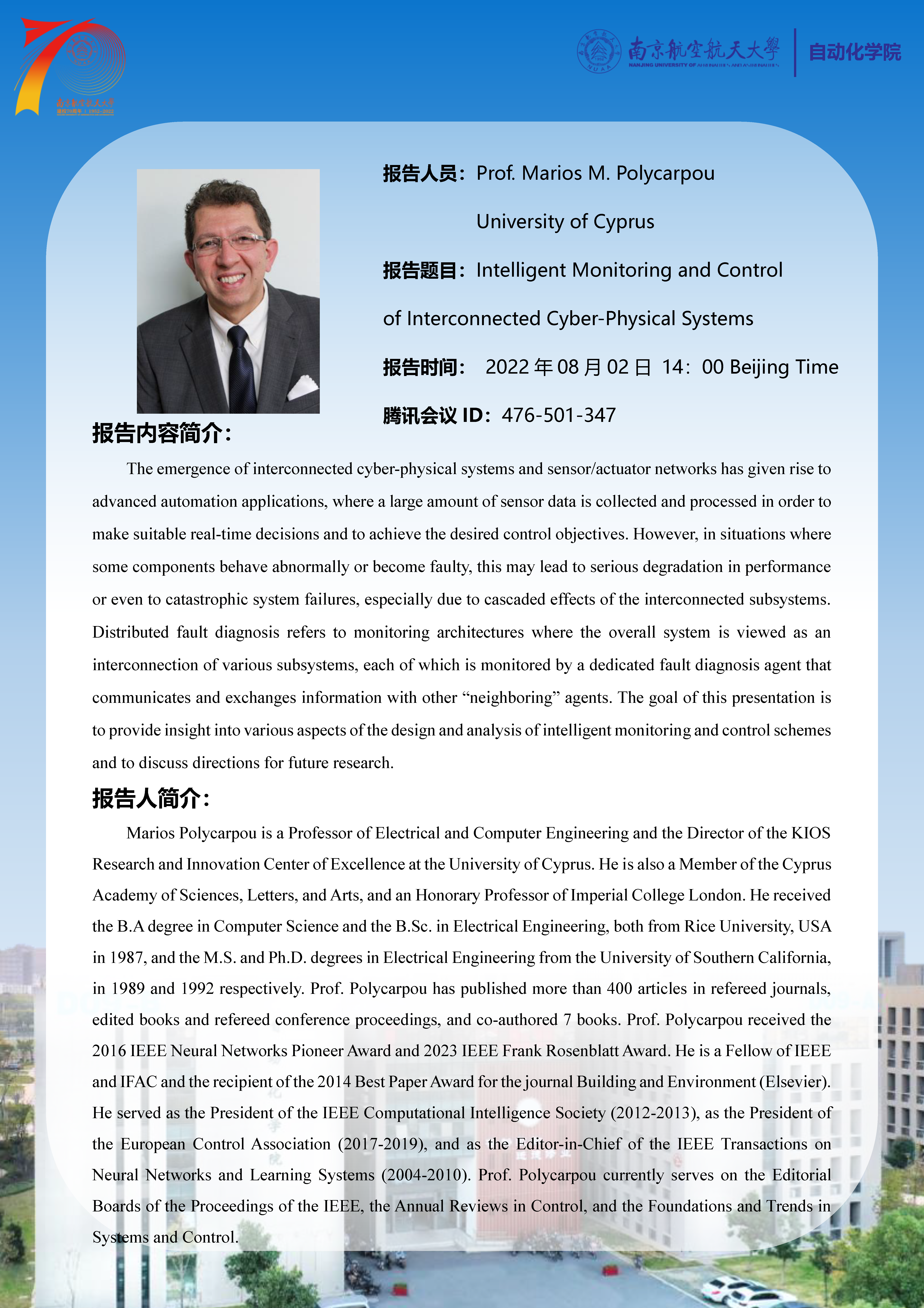 【学术报告】Intelligent Monitoring and Control of Interconnected Cyber-Physical Systems