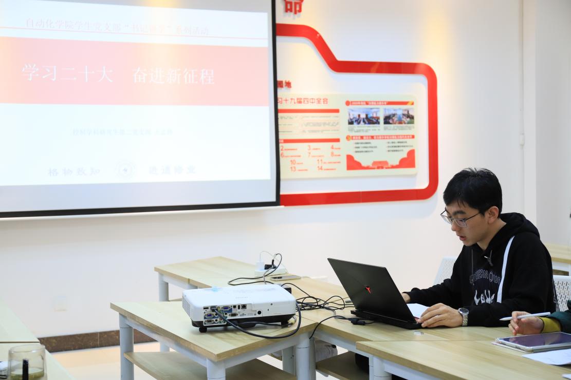 控制学科研究生第七党支部书记高韵婉对学生党员发展工作细则进行了解读。她以挂图作战的方式梳理了党员全过程培养体系,并结合《基层党支部党员发展工作负面清单》,对党支部建设中存在的问题进行了规范。她指出正值学生党员发展的关键时期,严把党员发展关是学院党建工作的关键。