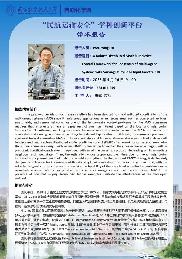 【学术报告】A Robust Distributed Model Predictive Control Framework for Consensus of Multi-Agent Systems with Varying Delays and Input Constraints
