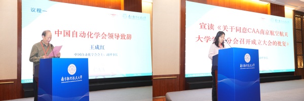 中国自动化学会王成红副理事长致辞,强调了中国自动化学会成立学生分会的初衷,鼓励南航学子积极参与学术与科研活动,为中国自动化学会和中国自动化领域做出更大的贡献。随后,中国自动化学会王馨爽老师宣读了《关于同意中国自动化学会南京航空航天大学学生分会召开成立大会的批复》。