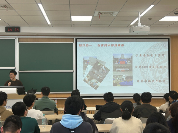 随后,21级自动化“卓越班”班长王介向24级的同学们分享了自己身处的“卓越班”的惊人变化和发展历程。他所在的“卓越班”不仅在学习成绩和科创竞赛中斩获颇丰,在各类评优评奖中也是屡拔头筹,更拥有诸多难能可贵的实践机会,能更好地让同学们在实践中了解行业的动态、接触一线的技术,既能丰富自己的履历,也能帮助同学们更加明确自己的学习目标。临近毕业,班上的同学也都有了满意的去处,这和“卓越班”一直以来坚持以实践为导向的精英化培养密不可分。希望24级的学弟学妹们能珍惜自动化“卓越班”的机会,保持优良的传统,取得更大的成绩。
