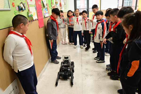 科普讲座后,仿生“机器狗”震撼登场。机器狗在支部成员的开发下,具有融合GNSS、视觉和激光雷达等多种信息源的组合导航功能,进行了自动避障、定位构图、人机协同等技术演示,赢得学生们阵阵惊叹。通过现场实物展示和互动体验,学生们直观感受到了导航技术的实际应用价值。学生在现场积极提问,热情参与。支部成员就“导航如何帮助机器人找到路径”、“未来导航还能用来做什么”等问题一一作答,鼓励学生勇敢探索、善于思考、敢于创新。